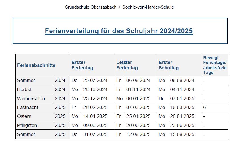 Ferienplan Schuljahr 2024/2025 Zur ausführlichen Gesamtansicht bitte pdf-Datei öffnen! Ferienverteilung Schuljahr 2024-2025 (51 KB)