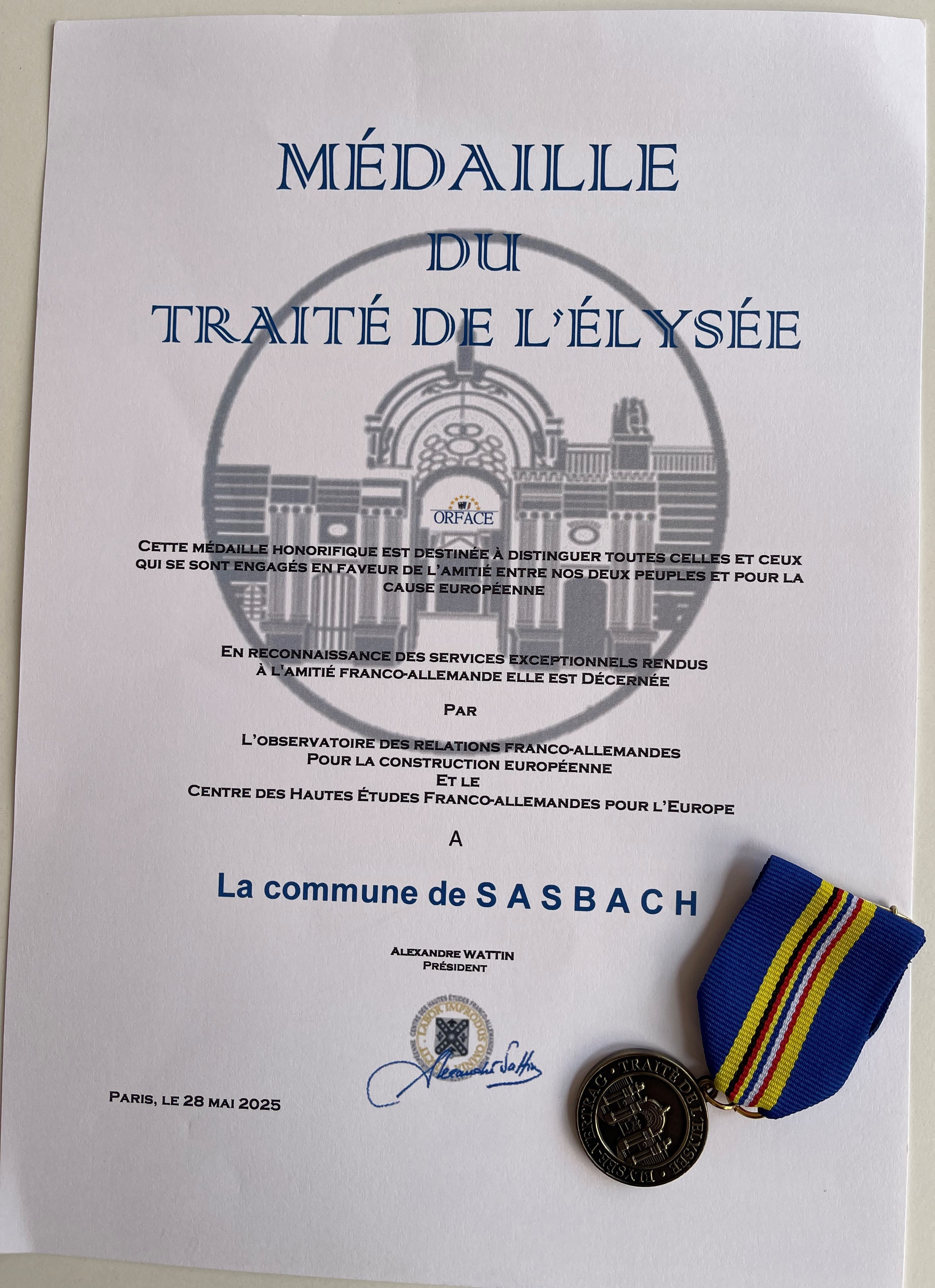 Eine besondere Note erhielt die Zeremonie, als der französische Generalkonsul Bürgermeisterin Opitz mit der Ehrenmedaille auszeichnete. Ebenso erhielt Rudi Retsch für seine Verdienste zur deutsch-französischen Verständigung diese Ehrung sowie die Gemeinde Sasbach als Ganzes. Bürgermeisterin Opitz bedankte sich für diese Würdigung. „Diese Auszeichnung nehme ich als Zeichen der Wertschätzung für die ganze Gemeinde Sasbach und unsere gemeinsame Arbeit für die deutsch-französische Freundschaft mit Freude entgegen“, sagte die Bürgermeisterin und lud die Gäste zu einem Ehrenwein ein.